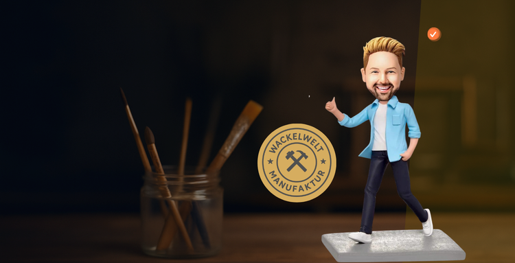 Die Herstellung deiner individuellen Wackelfigur bei Wackelwelt.de nimmt in der Regel ca. 3–5 Wochen in Anspruch. Jeder Wackelkopf wird von unseren erfahrenen Modellierern und Künstlern in sorgfältiger Handarbeit gefertigt – von der detaillierten Ausarbeitung des Gesichts über das Formen der Figur bis hin zur abschließenden Bemalung. Da jede Figur ein echtes Unikat ist, hängt die Bearbeitungszeit auch von der aktuellen Auftragslage sowie von der gewählten Individualisierung ab (z. B. spezielle Posen, Accessoires oder aufwändige Details). Wenn es einmal schneller gehen soll, bieten wir zusätzlich eine Express-Option an. Mit dieser Serviceleistung verkürzt sich die Produktionszeit deutlich, sodass deine persönliche Wackelfigur rechtzeitig zu besonderen Anlässen wie Geburtstagen, Hochzeiten oder Firmenjubiläen geliefert werden kann. 💡 Tipp: Plane deine Bestellung rechtzeitig ein – insbesondere vor Feiertagen oder zu Hochzeiten, wenn viele Kunden gleichzeitig bestellen. So stellst du sicher, dass dein individuelles Wackelwelt-Geschenk pünktlich bei dir oder direkt beim Beschenkten ankommt.