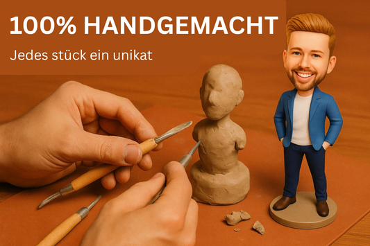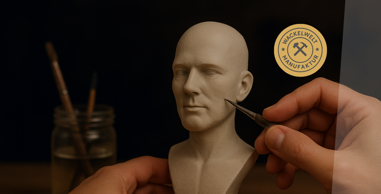Die Herstellung deiner individuellen Wackelfigur bei Wackelwelt.de nimmt in der Regel ca. 3–5 Wochen in Anspruch. Jeder Wackelkopf wird von unseren erfahrenen Modellierern und Künstlern in sorgfältiger Handarbeit gefertigt – von der detaillierten Ausarbeitung des Gesichts über das Formen der Figur bis hin zur abschließenden Bemalung. Da jede Figur ein echtes Unikat ist, hängt die Bearbeitungszeit auch von der aktuellen Auftragslage sowie von der gewählten Individualisierung ab (z. B. spezielle Posen, Accessoires oder aufwändige Details). Wenn es einmal schneller gehen soll, bieten wir zusätzlich eine Express-Option an. Mit dieser Serviceleistung verkürzt sich die Produktionszeit deutlich, sodass deine persönliche Wackelfigur rechtzeitig zu besonderen Anlässen wie Geburtstagen, Hochzeiten oder Firmenjubiläen geliefert werden kann. 💡 Tipp: Plane deine Bestellung rechtzeitig ein – insbesondere vor Feiertagen oder zu Hochzeiten, wenn viele Kunden gleichzeitig bestellen. So stellst du sicher, dass dein individuelles Wackelwelt-Geschenk pünktlich bei dir oder direkt beim Beschenkten ankommt.